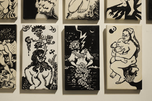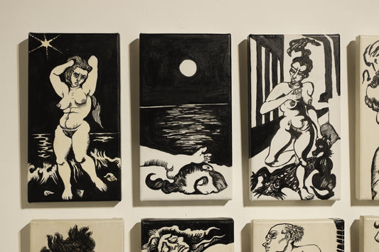 Radha Gomaty is a multidisciplinary artist, poet, and actor. She studied Fine Arts at MS University, Baroda, and pursued postgraduate studies in Art History at Visva-Bharati University, Santiniketan. Her practice spans painting, sculpture, video, performance, and writing, often exploring mythopoeic themes with a figurative approach.