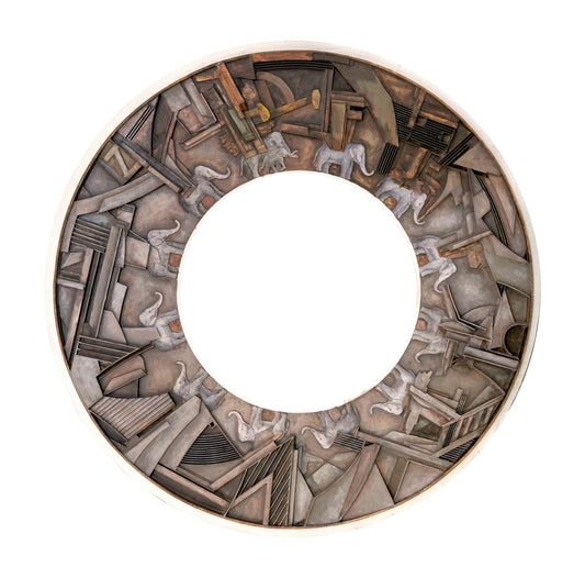 Central to his recent work is the anthropomorphic- or at times, bionic- form embedded within the landscape: figures that traverse and occupy time, space, and geography. In Gestalt, his integration of architectonic forms and abstract topographies creates morphic diagrams where circles, squares, and fractured geometries overlap to articulate a larger logic of shifting wholes. These compositions evoke the layered complexity of both natural and constructed environments- where the built world and the body merge in mutable states of being.